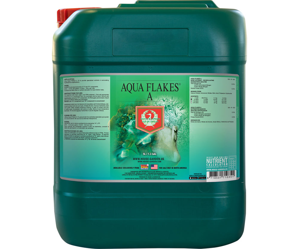 House & Garden Aqua Flakes is the complete base nutrient formulated specifically for recirculating systems. Aqua Flakes A & Aqua Flakes B are ideal for expanded clay, mineral wool, deep water culture (DWC), aeroponics, and other forms of recirculating hydroponic cultivation. The H&G formulation and blending methodology allows for a perfect ratio of combined nutrients to optimize medical-grade cultivation in aerated systems. The result for you? Longer lasting pH stability, consistent nutrient uptake, faster plant growth, and balanced, plant-specific EC levels.